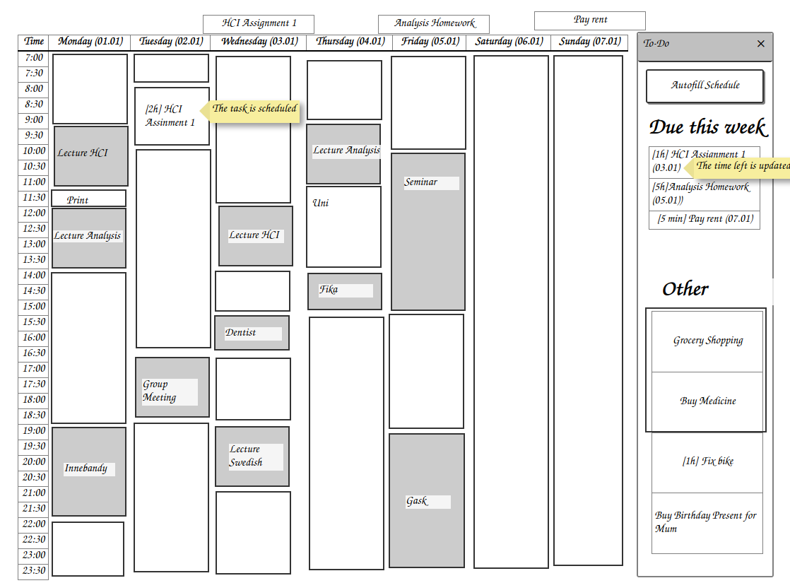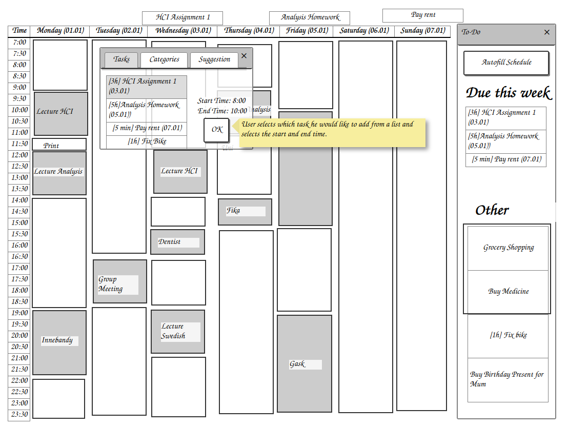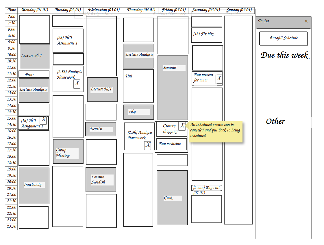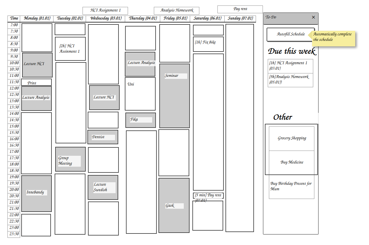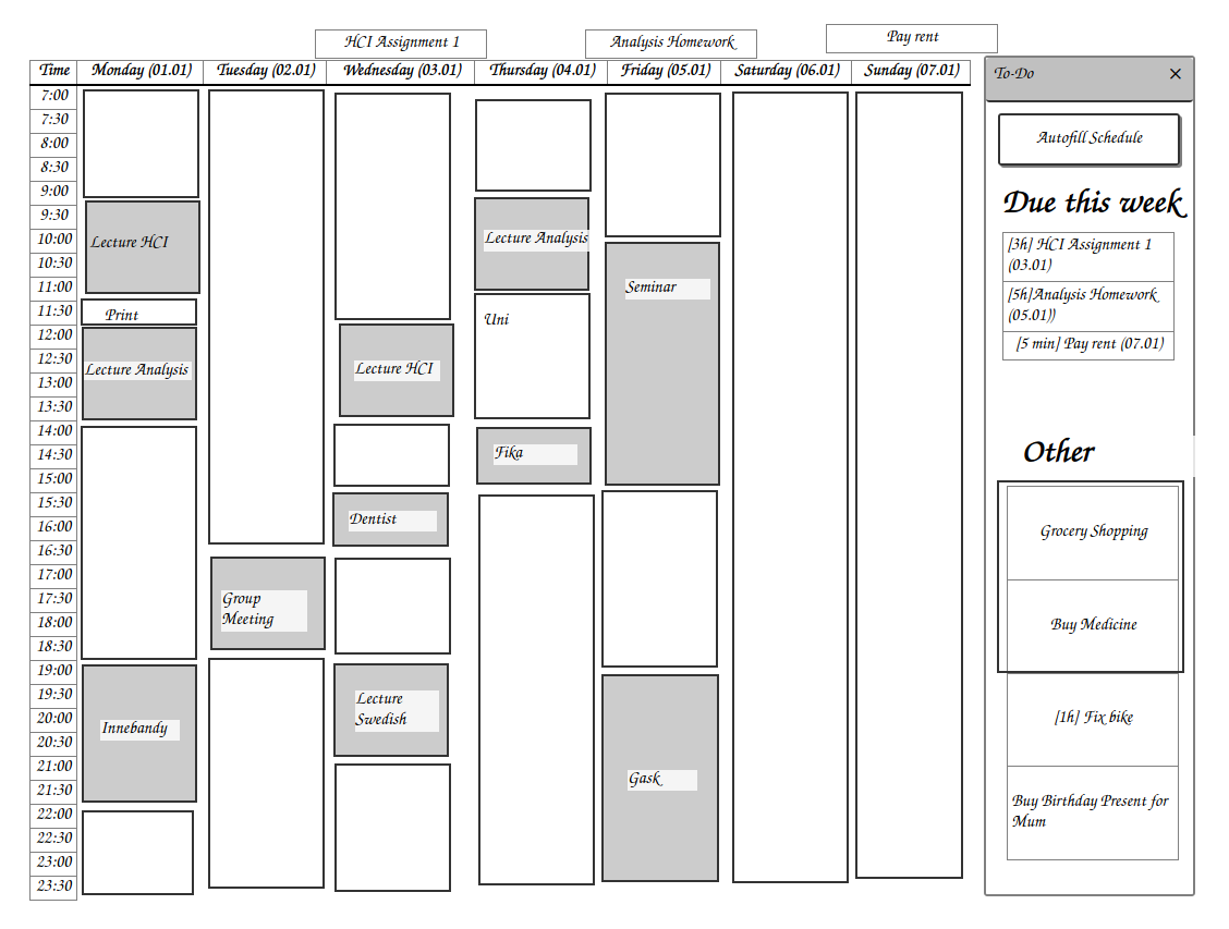 This autumn I took a course in human computer interaction. The task was to think of a project idea, interview participants to gather data for actual needs, draw prototypical sketches and lastly, create a prototype. My idea was to create a to-do application that focuses on scheduling to-dos as calendar events to enable week planning.