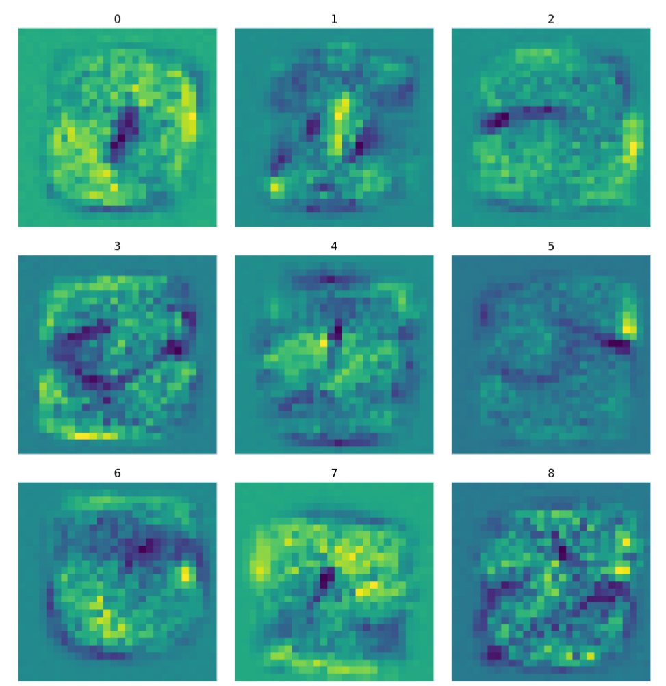 A classical introduction example for machine learning is the use of the MNIST dataset. In this assignment each student needed to extend the linear classifier from assignment 1 to a full neural network. Libraries were restriced to numpy. Also, part of the task was to plot the weights of the network to see if they are related to the actual numers. This is the resulting images for each of the numbers. It is not really possible to guess which weights belong to which number wthout prior knowledge.